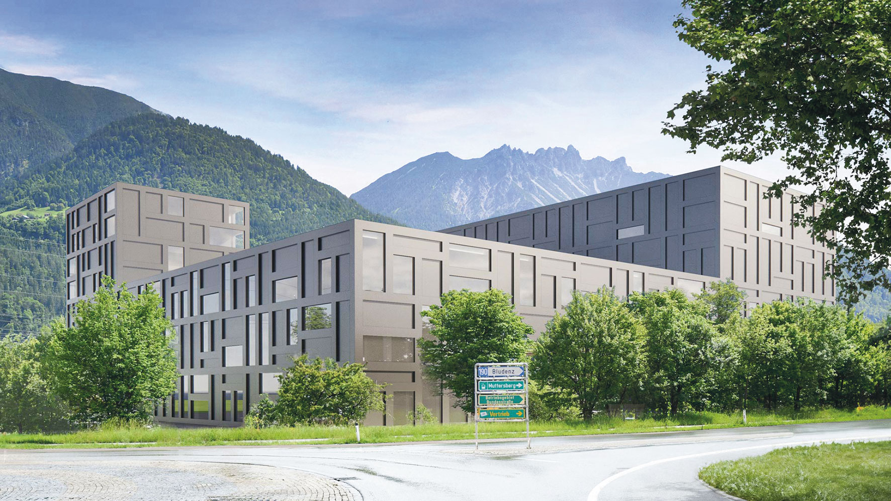 So soll sich die „Bertsch-Kreuzung“ künftig präsentieren. Auf dem ehemaligen Areal der Firma Bertsch Kessel werden auf vier Ebenen Lager und Räumlichkeiten für die Getzner Werkstoffe und die Getzner Circular Technologies geschaffen.