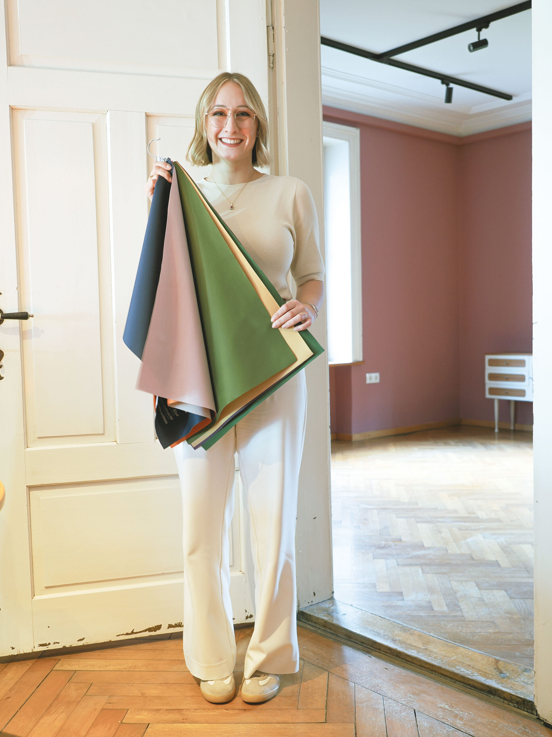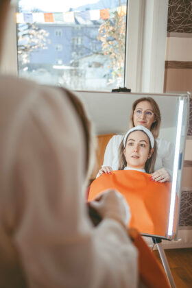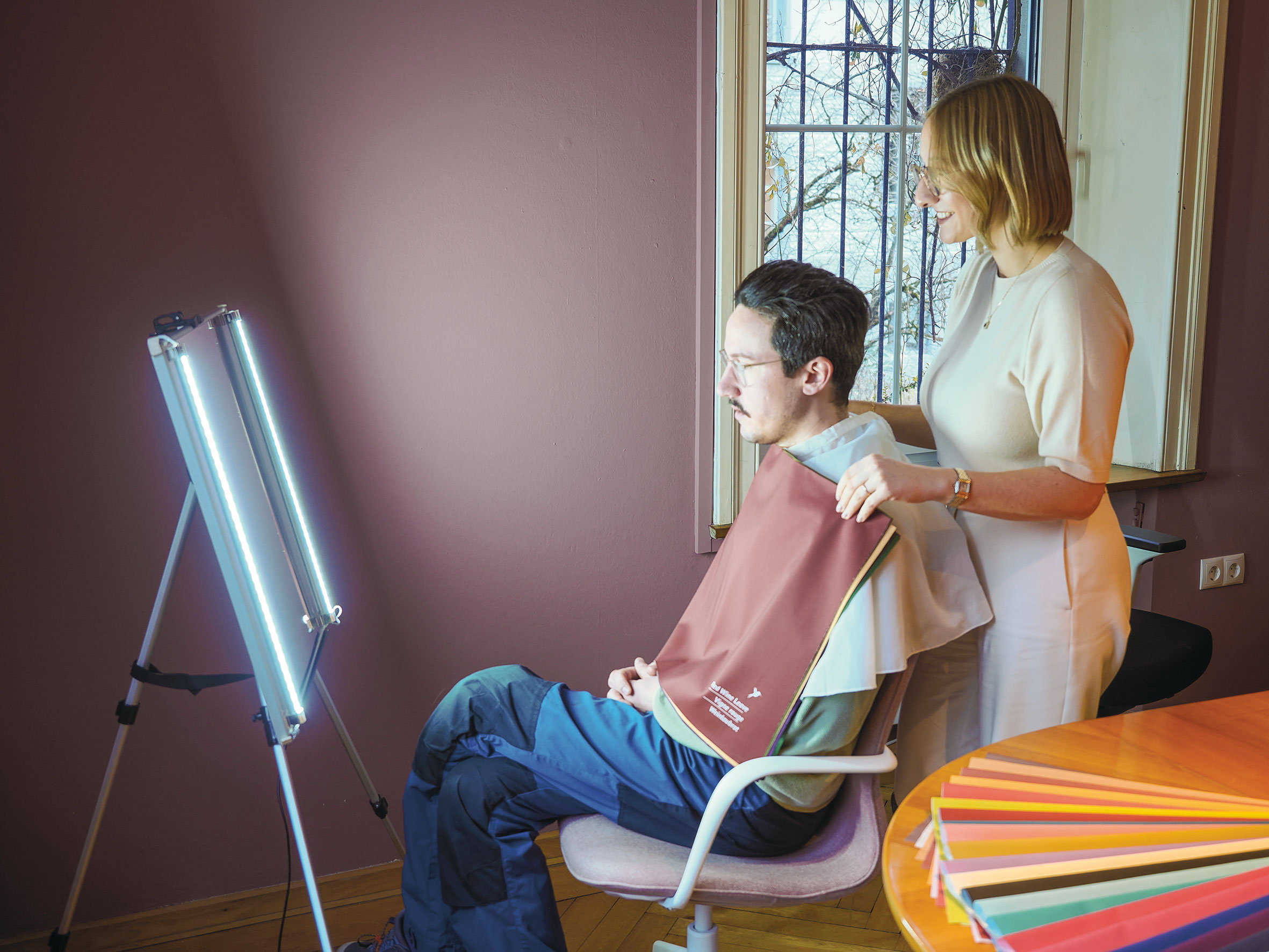 Voraussetzung für eine solche Veränderung ist natürlich, dass es auf der persönlichen Ebene zwischen Beraterin und Kundin passt. Dies versucht sie gleich beim ersten Kennenlernen – oft auch online – abzuklopfen. Zum Beratungstermin kommt sie – mit beleuchtetem Spiegel, Farbkarten und Stoffmustern ausgerüstet – meist zu den Kundinnen nach Hause. Trotzdem hat sie sich seit Anfang Februar im Muut-Office in Bludenz eingemietet, um bei Bedarf Räumlichkeiten parat zu haben, in die sie jene einladen kann, die sich eine neutralere Umgebung für das Beratungsgespräch wünschen.