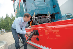 Diese Bemühungen wurden von der Republik Österreich im Jahr 2009 mit der Auszeichnung „Kompetenz im Klimaschutz“ gewürdigt. Verantwortung für den Umweltschutz nimmt man bei Vögel seit vielen Jahren auch wahr, wenn neue Fahrzeuge angeschafft werden müssen: Kraftstoffverbrauch und Emissionswerte spielen bei der Kaufentscheidung eine zentrale Rolle. Am Ende des Tages geht es aber natürlich auch um die Wirtschaftlichkeit. In einem „allerhand!“-Interview 2021 hatte Sohn Stefan Vögel anlässlich der damaligen Anschaffung von vierzig besonders abgasarmen Scania-Lkw erklärt, dass man die technischen Entwicklungen immer genau beobachte und auch bereit sei, im Interesse des Umweltschutzes zu investieren. Die Entwicklung schreitet rasch voran – und so wurde in den letzten beiden Jahren der Fuhrpark um zusätzliche 53 lärmarme Neufahrzeuge erweitert.Im Februar 2024 wurde die gesamte Flotte auf den Betrieb mit dem aus Altspeiseöl, Altfetten und anderen biogenen Abfällen gewonnenen Kraftstoff HVO umgestellt. Mit HVO betriebene Motoren stoßen im Vergleich zum herkömmlichen Dieselbetrieb 90 Prozent weniger CO2 aus. Die Mehrkosten von etwa 15 Cent pro Liter fallen bei einem Verbrauch von mehreren Millionen Litern jährlich natürlich schon ins Gewicht. Andererseits habe man mit diesem Umstieg auf HVO umweltbewusste Kunden halten und neue dazugewinnen können. Wer für sein Produkt eine ehrliche Ökobilanz vorlegen will, muss nämlich auch den Aufwand für den Transport des Produktes beziehungsweise der einzelnen Bestandteile des Produktes mit einrechnen: Eine solche Gesamtbetrachtung gewinnt bei den Endkunden – und nicht zuletzt durch entsprechende EU-Verordnungen – immer mehr an Bedeutung. Gerade für Vorarlberger (Industrie-) Betriebe, die Rohstoffe in der Regel importieren und die damit hergestellten Produkte exportieren müssen, spielt der möglichst umweltfreundliche Transport eine große Rolle.